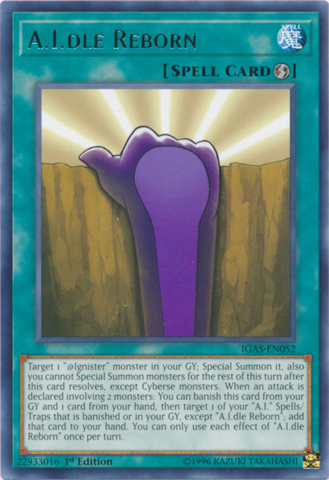 Target 1 "@Ignister" monster in your GY; Special Summon it, also you cannot Special Summon monsters for the rest of this turn after this card resolves, except Cyberse monsters. When an attack is declared involving 2 monsters: You can banish this card from your GY and 1 card from your hand, then target 1 of your "A.I." Spells/Traps that is banished or in your GY, except "A.I.dle Reborn"; add that card to your hand. You can only use each effect of "A.I.dle Reborn" once per turn.