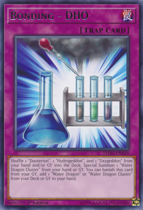 Shuffle 1 "Duoterion", 1 "Hydrogeddon", and 1 "Oxygeddon" from your hand and/or GY into the Deck; Special Summon 1 "Water Dragon Cluster" from your hand or GY. You can banish this card from your GY; add 1 "Water Dragon" or "Water Dragon Cluster" from your Deck or GY to your hand.