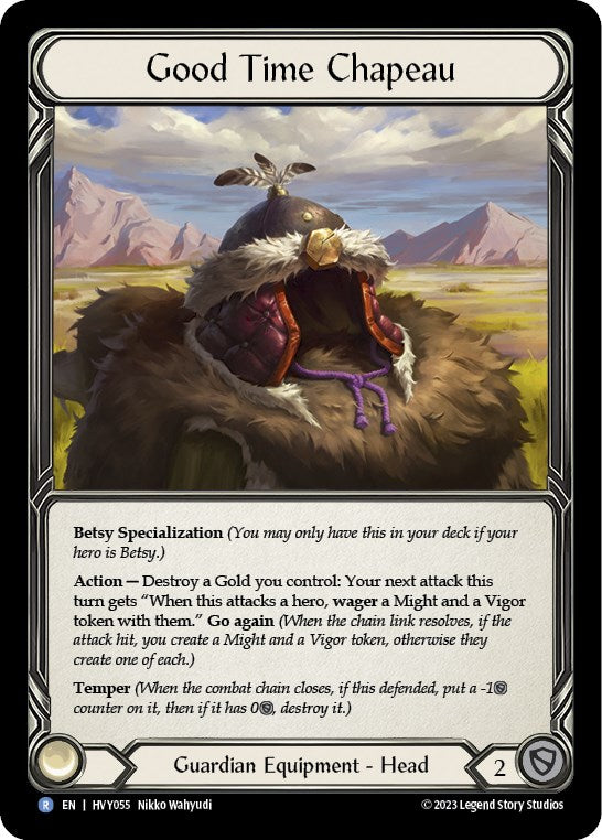 Betsy Specialization (You may only have this in your deck if your hero is Betsy.) Action -- Destroy a Gold you control: Your next attack this turn gets "When this attacks a hero, wager a Might and a Vigor token with them." Go again (When the chain link resolves, if the attack hit, you create a Might and a Vigor token, otherwise they create one of each.) Temper (When the combat chain closes, if this defended, put a -1DEFENSE counter on it, then if it has 0DEFENSE, destroy it.)