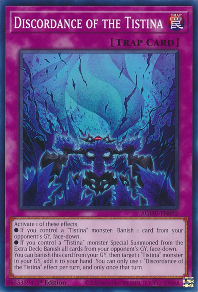 Activate 1 of these effects; • If you control a "Tistina" monster: Banish 1 card from your opponent's GY, face-down. • If you control a "Tistina" monster Special Summoned from the Extra Deck: Banish all cards from your opponent's GY, face-down. You can banish this card from your GY, then target 1 "Tistina" monster in your GY; add it to your hand. You can only use 1 "Discordance of the Tistina" effect per turn, and only once that turn.