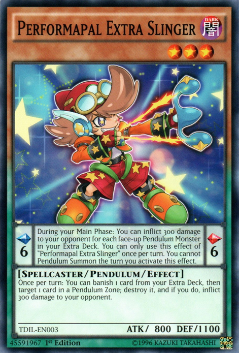 Once per turn: You can banish 1 card from your Extra Deck, then target 1 card in a Pendulum Zone; destroy it, and if you do, inflict 300 damage to your opponent.