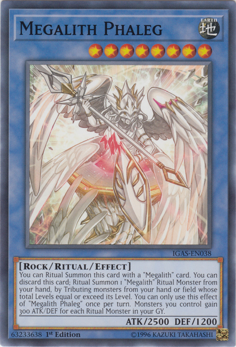 You can Ritual Summon this card with a "Megalith" card. You can discard this card; Ritual Summon 1 "Megalith" Ritual Monster from your hand, by Tributing monsters from your hand or field whose total Levels equal or exceed its Level. You can only use this effect of "Megalith Phaleg" once per turn. Monsters you control gain 300 ATK/DEF for each Ritual Monster in your GY.