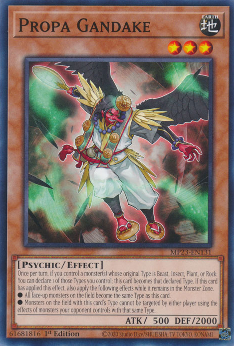 Once per turn, if you control a monster(s) whose original Type is Beast, Insect, Plant, or Rock: You can declare 1 of those Types you control; this card becomes that declared Type. If this card has applied this effect, also apply the following effects while it remains in the Monster Zone. • All face-up monsters on the field become the same Type as this card. • Monsters on the field with this card's Type cannot be targeted by either player using the effects of monsters your opponent controls with that same Type.