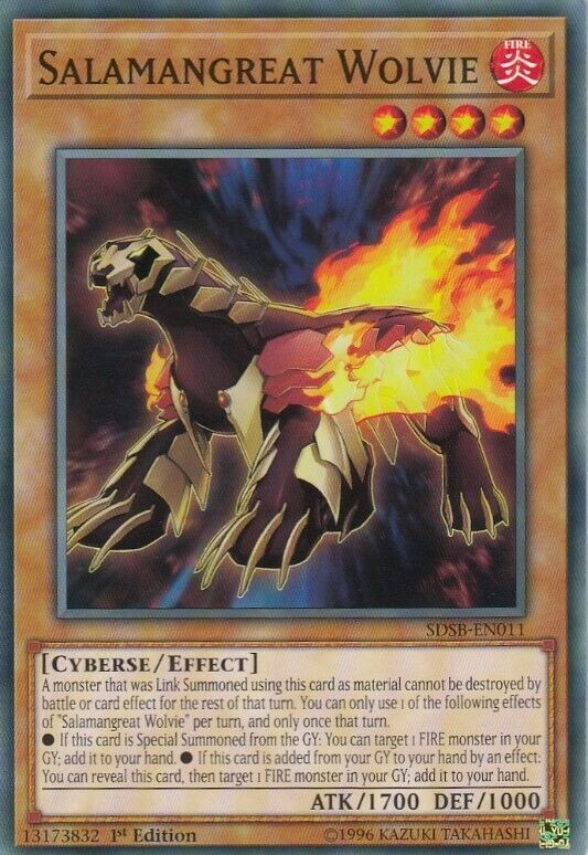 A monster that was Link Summoned using this card as material cannot be destroyed by battle or card effect for the rest of that turn. You can only use 1 of the following effects of "Salamangreat Wolvie" per turn, and only once that turn. • If this card is Special Summoned from the GY: You can target 1 FIRE monster in your GY; add it to your hand. • If this card is added from your GY to your hand by an effect: You can reveal this card, then target 1 FIRE monster in your GY; add it to your hand.