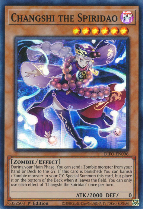 During your Main Phase: You can send 1 Zombie monster from your hand or Deck to the GY. If this card is banished: You can banish 1 Zombie monster in your GY; Special Summon this card, but place it on the bottom of the Deck when it leaves the field. You can only use each effect of "Changshi the Spiridao" once per turn.