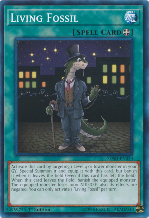 Activate this card by targeting 1 Level 4 or lower monster in your GY; Special Summon it and equip it with this card, but banish it when it leaves the field (even if this card has left the field). When this card leaves the field, banish the equipped monster. The equipped monster loses 1000 ATK/DEF, also its effects are negated. You can only activate 1 "Living Fossil" per turn.