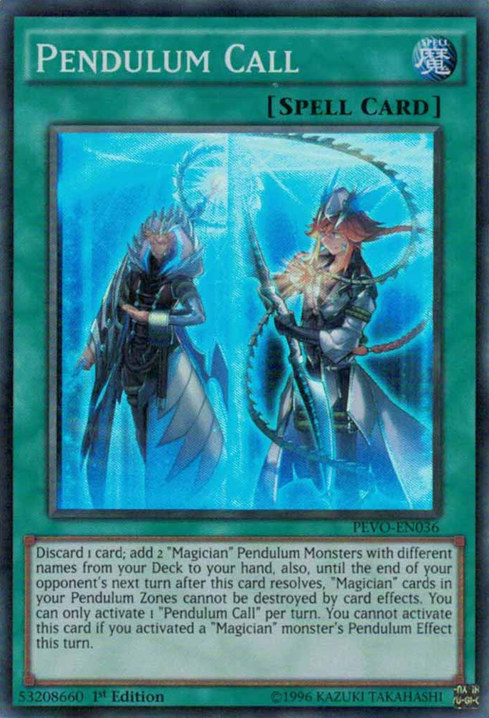 Discard 1 card; add 2 "Magician" Pendulum Monsters with different names from your Deck to your hand, also, until the end of your opponent's next turn after this card resolves, "Magician" cards in your Pendulum Zones cannot be destroyed by card effects. You can only activate 1 "Pendulum Call" per turn. You cannot activate this card if you activated a "Magician" monster's Pendulum Effect this turn.
