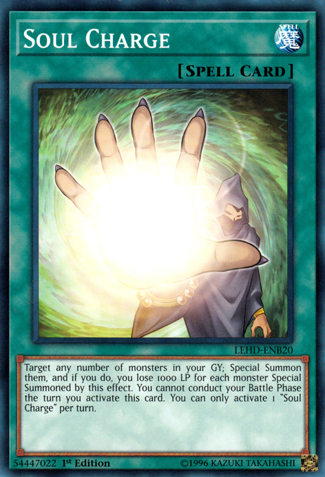 Target any number of monsters in your GY; Special Summon them, and if you do, you lose 1000 LP for each monster Special Summoned by this effect. You cannot conduct your Battle Phase the turn you activate this card. You can only activate 1 "Soul Charge" per turn.